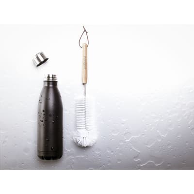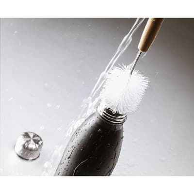 Reinigingsborstel voor het makkelijk schoonmaken van drinkflessen. Ook geschikt voor flessen met een smalle hals. Door de gedraaide borstelkop kan ook de bodem goed worden gereinigd. Met houten handgreep en ophanglus.