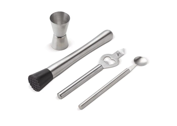 Maak de lekkerste cocktails met deze cocktailset. De hoogwaardige roestvrijstalen set is uitgerust met een stamper voor het malen van ingrediënten, een maatbekertje voor het afmeten van de hoeveelheden, een flesopener en een roerlepel. Wordt in geleverd in geschenkverpakking.