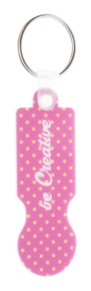 Muntensleutelhanger van plastic winkelwagenmuntje met kleurenafbeeldingen. Prijs inclusief UV LED-bedrukking aan één zijde. MOQ: 200 stuks.
