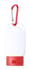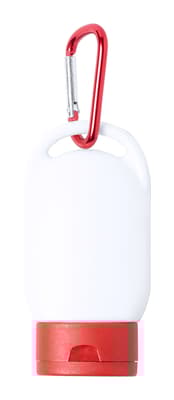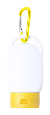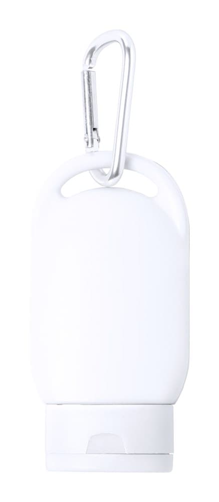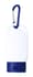 Zonnebrandlotion in plastic container met bijpassende kleur dop en karabijnhaak. SPF30 bescherming, 30 ml.