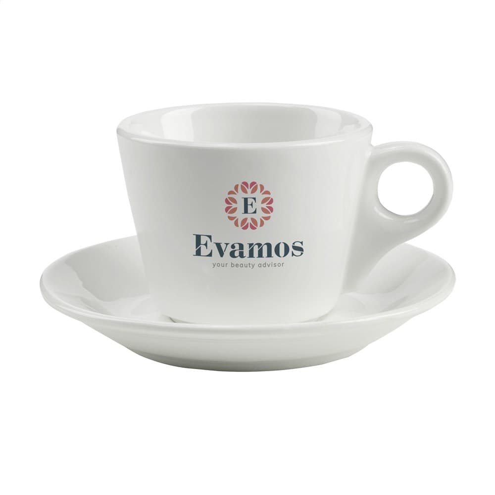 Koffiekop en schotel van hoogwaardig keramiek. Vaatwasserbestendig. Inhoud 205 ml. Vaatwasserbestendig. De opdruk is vaatwasmachine getest en gecertificeerd: EN 12875-2. Afm. kop 7 x Ø 8,5 cm. Afm. schotel Ø 13,8 cm.