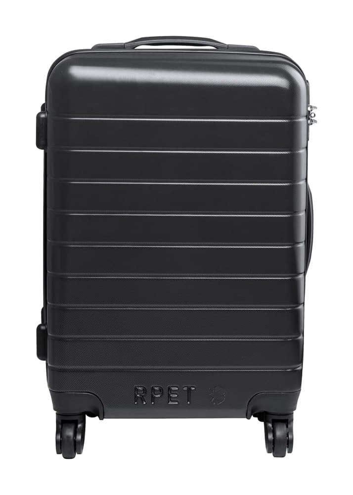 RPET kunststof koffer met 4 dubbele wielen, telescopisch handvat en TSA cijferslot. Met RPET binnenvoering en elastische bevestigingsbanden. Met kenmerkend RPET teken.