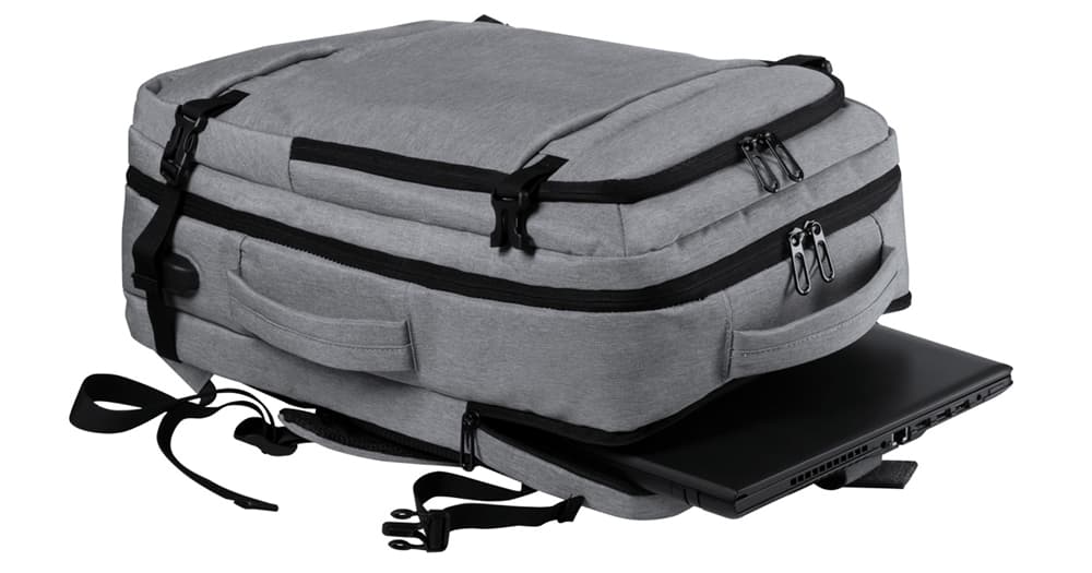 Rugzak met dubbele functie en documententas met meerdere compartimenten met ritssluiting, antidiefstalvak, gewatteerd laptopvak, (15"), gewatteerde rug- en schouderbanden. Met trolleyriem en ingebouwde USB- aansluiting voor stroomvoorziening.