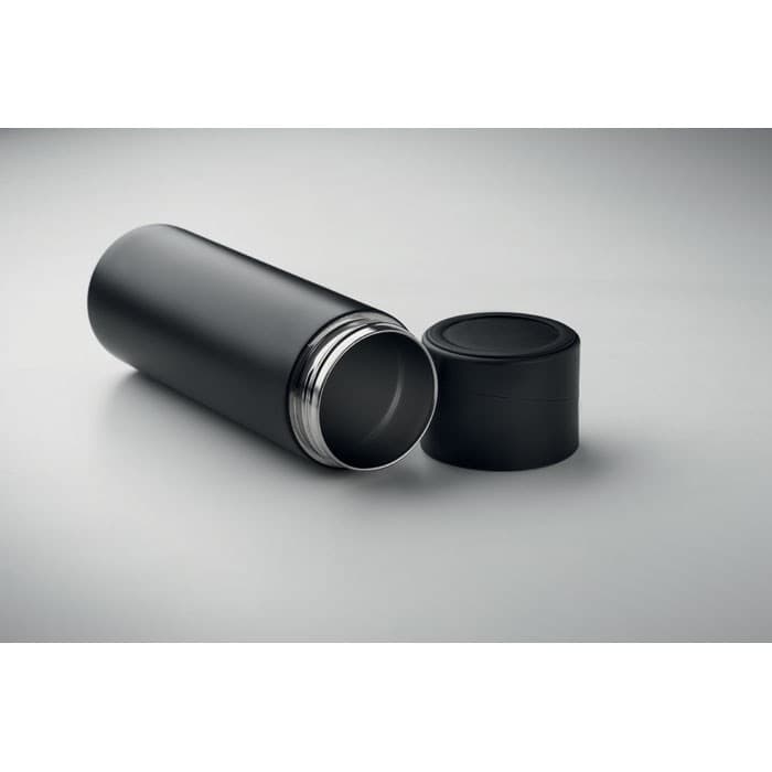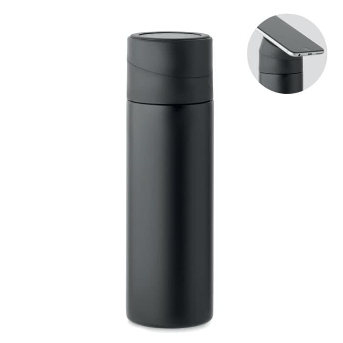 Dubbelwandige vacuüm isolerende thermosfles van gerecycled roestvrij staal (90% gerecycled roestvrij staal en 10% roestvrij staal) met siliconen antislip telefoonhouder dop. Lekvrij. Inhoud: 420ml.