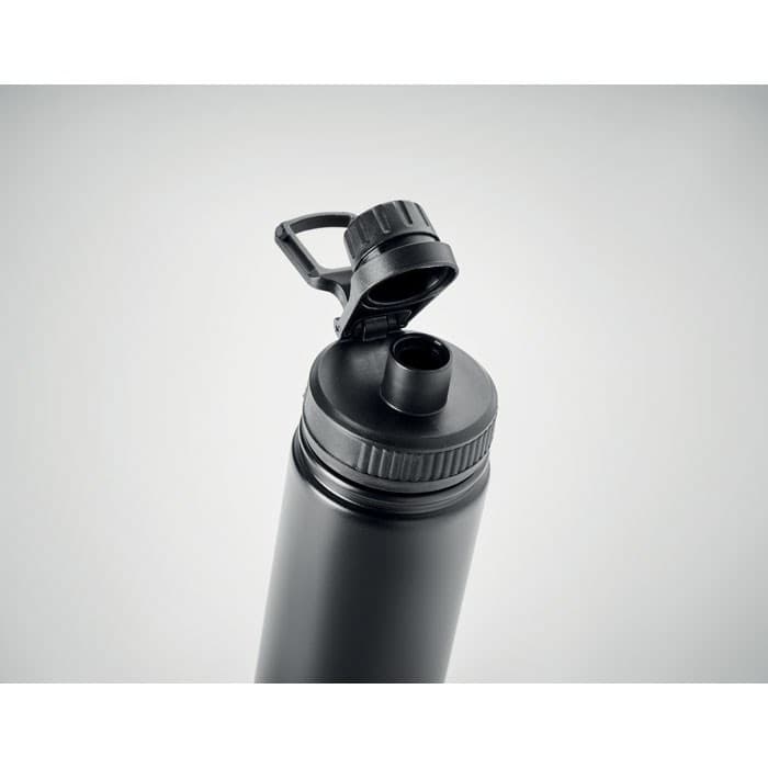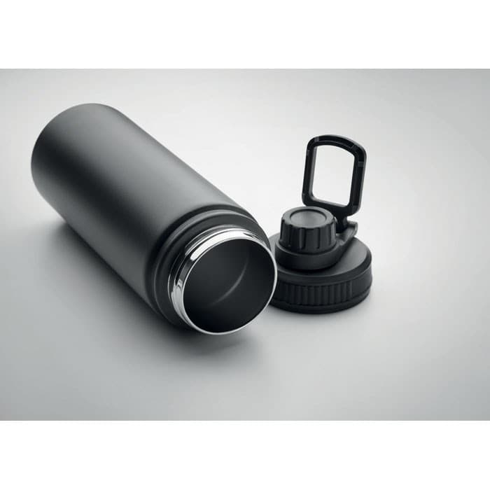 Dubbelwandige roestvrijstalen vacuüm geïsoleerde fles met drinkdop op het deksel en handgreep. Capaciteit: 500 ml.