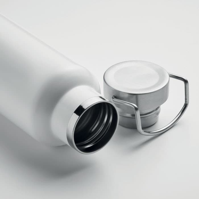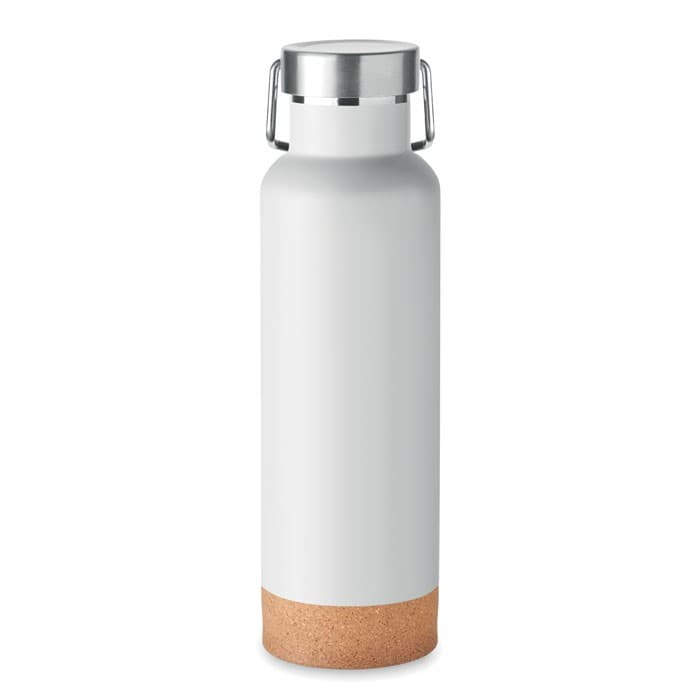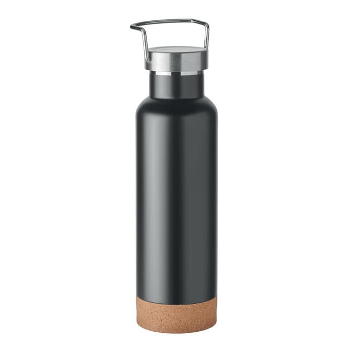 Dubbelwandige vacuümgeïsoleerde thermosfles van gerecycled roestvrij staal met handvatdeksel en kurkdetailbodem. Lekvrij. Inhoud: 500 ml. (90% gerecycled roestvrij staal en 10% roestvrij staal).