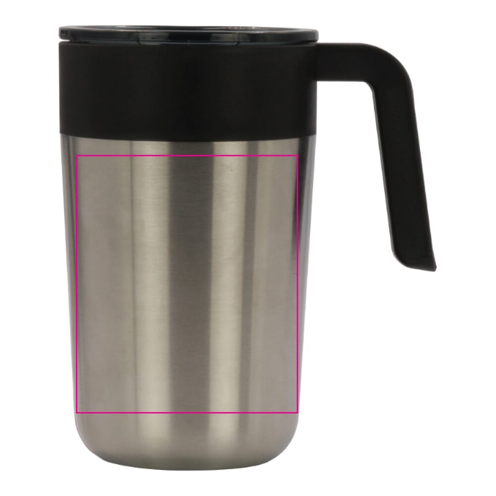 Dubbelwandige koffiebeker met deksel. Roestvrijstaal aan de buitenkant en PP aan de binnenkant. Dit model houdt koffie/thee langer warm door de dubbelwandigheid en de afsluitbare deksel met drinkopening. Wordt geleverd in een geschenkverpakking.