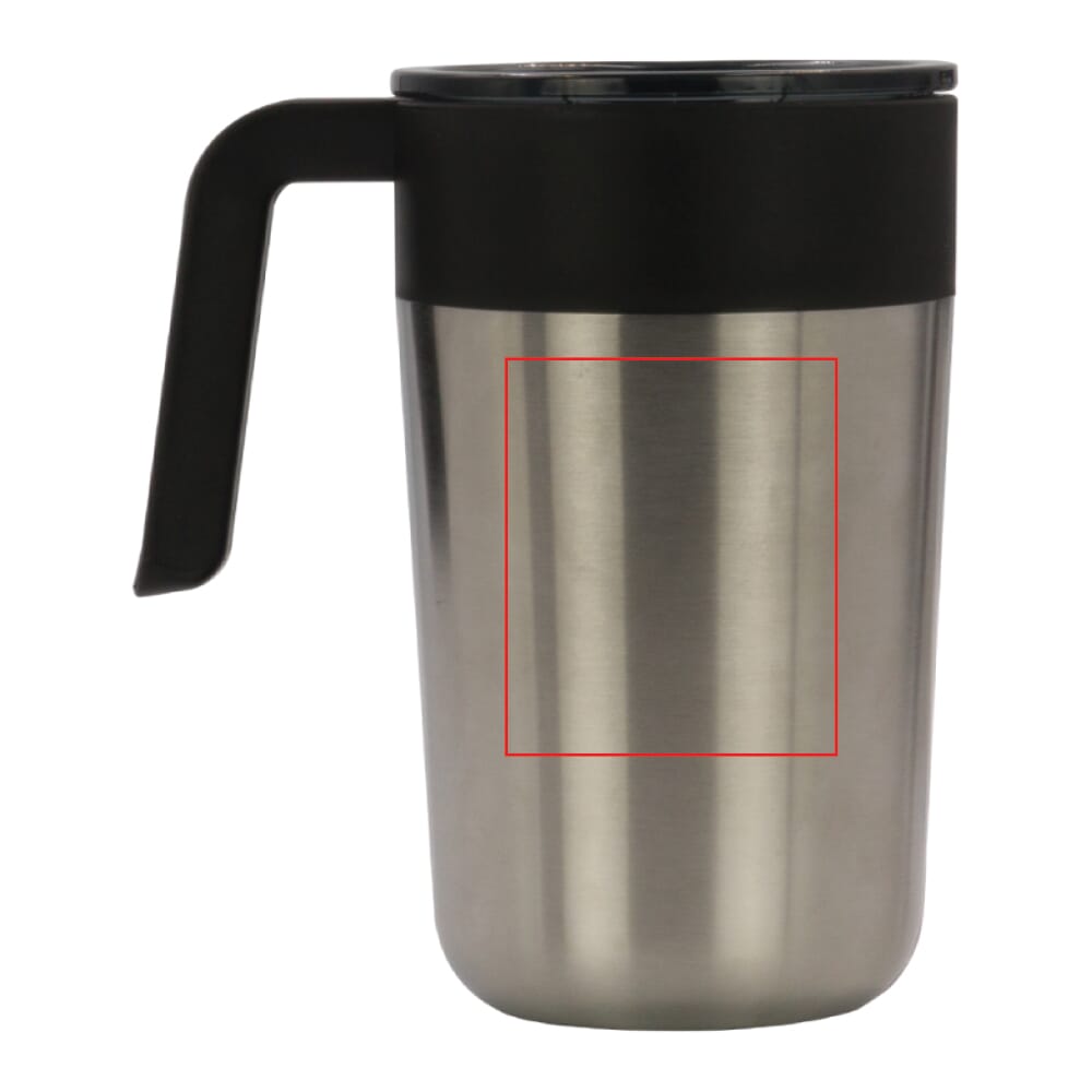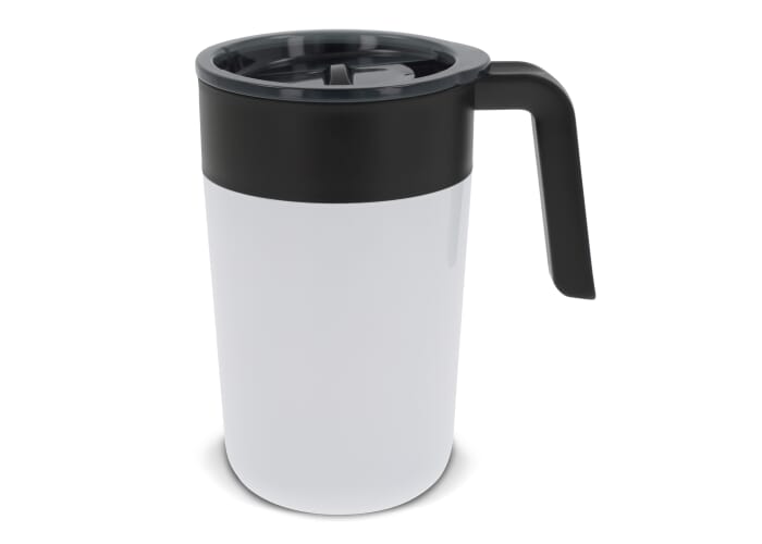 Dubbelwandige koffiebeker met deksel. Roestvrijstaal aan de buitenkant en PP aan de binnenkant. Dit model houdt koffie/thee langer warm door de dubbelwandigheid en de afsluitbare deksel met drinkopening. Wordt geleverd in een geschenkverpakking.