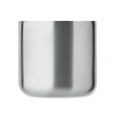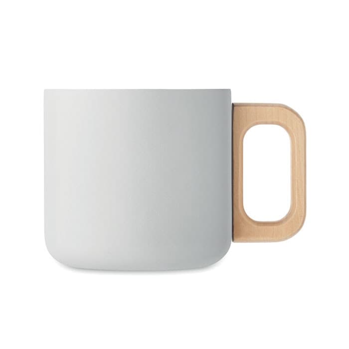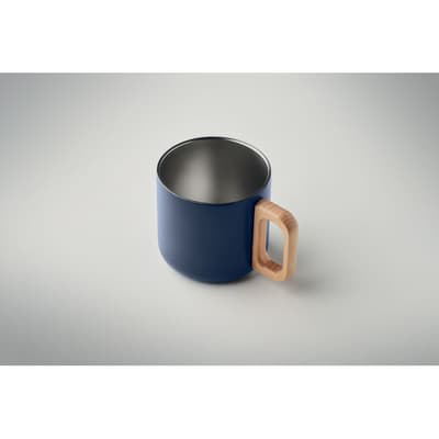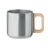 Dubbelwandige stalen mok van gerecycled roestvrij staal (90% gerecycled roestvrij staal en 10% roestvrij staal) met houten handvat. Inhoud: 350ml. Ideaal voor mokken bedrukken.