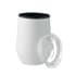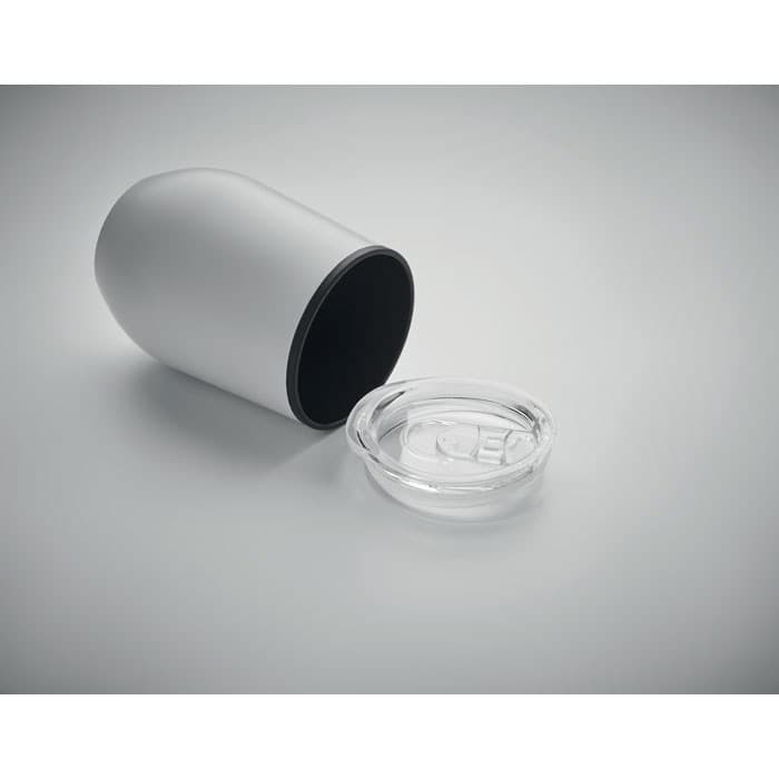 Dubbelwandige roestvrijstalen beker met PP binnenzijde en transparant PS deksel. Inhoud: 350 ml.