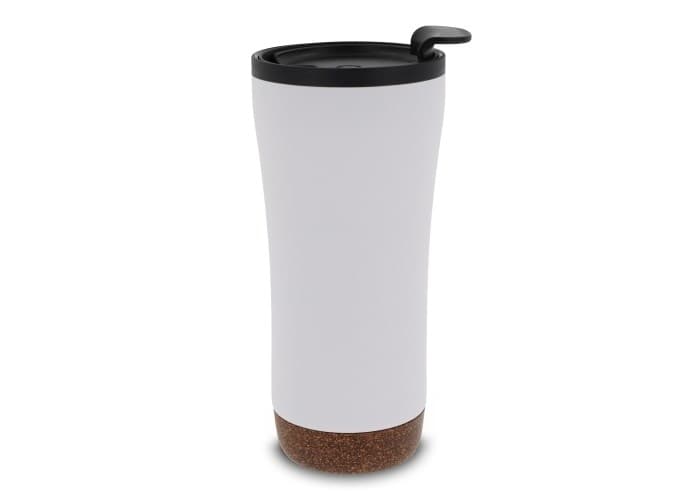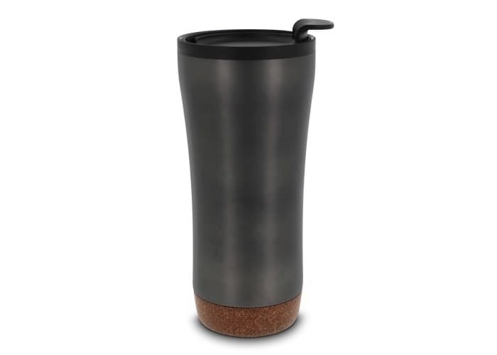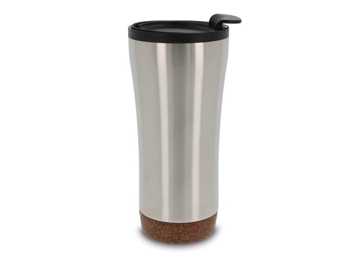 Dubbelwandige koffie beker met deksel. Roestvrijstaal aan de buitenkant en PP aan de binnenkant. Dit model houdt koffie/thee langer warm door de dubbelwandigheid en de afsluitbare deksel met drinkopening. De onderkant is gemaakt van kurk wat er voor zorgt dat de onderkant niet krast en het voorkomt koffiekringen op de tafel van koffie die langs de fles druppelt. Wordt geleverd in een geschenkverpakking.