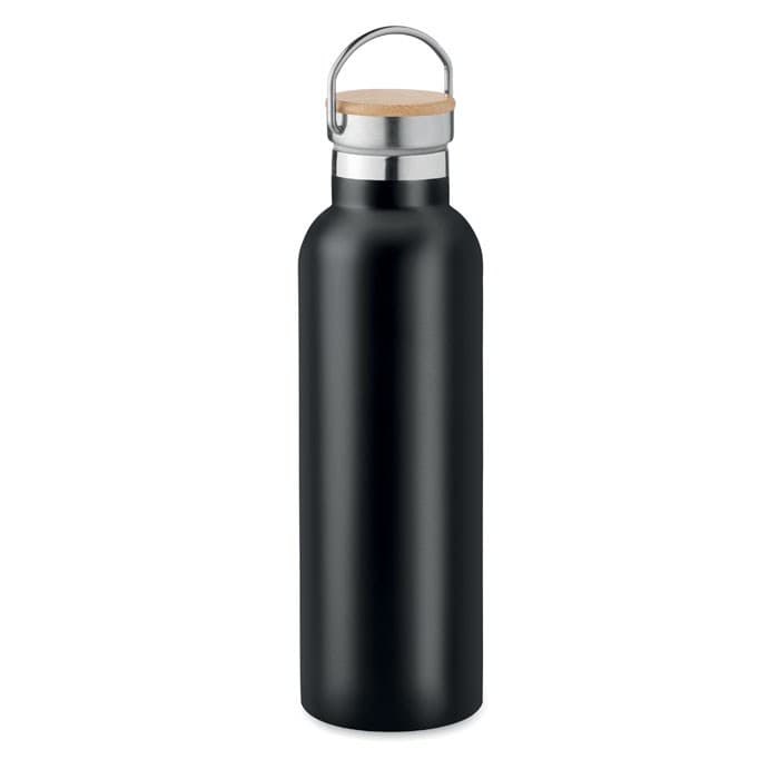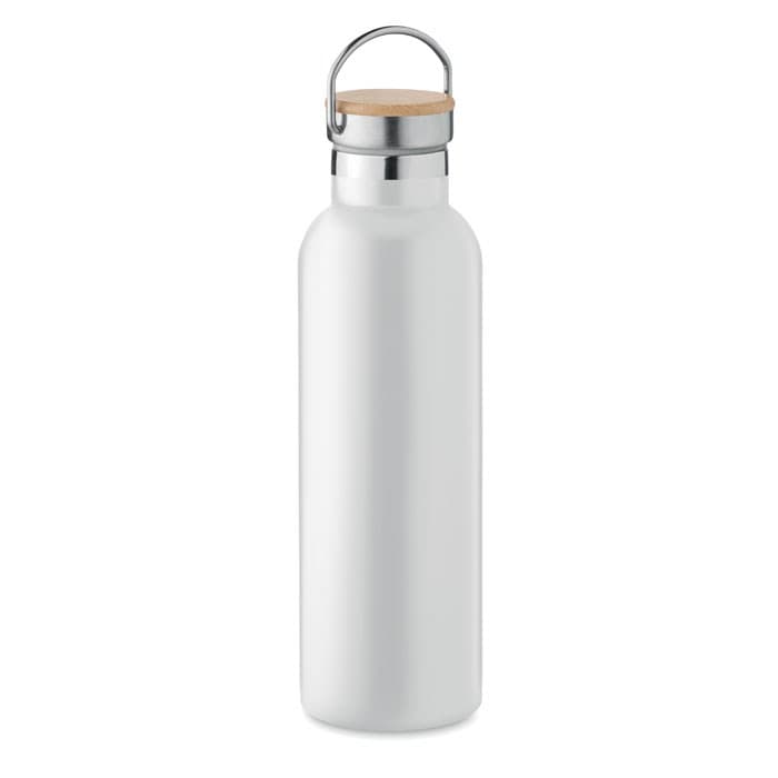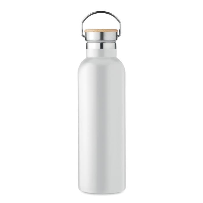 Dubbelwandige vacuüm geïsoleerde RVS drinkfles met bamboe deksel en draagring. Inhoud: 750 ml.Lekvrij. Bamboe is een natuurlijk product, de kleur per artikel kan verschillen.