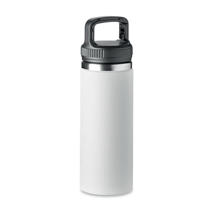 Dubbelwandige roestvrijstalen vacuüm geïsoleerde fles met haakhanger op deksel. Capaciteit: 500 ml.