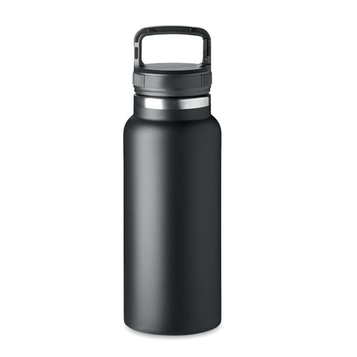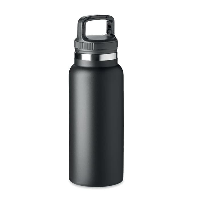 Dubbelwandige roestvrijstalen vacuümgeïsoleerde fles met haakhanger op het deksel. Inhoud: 970 ml.