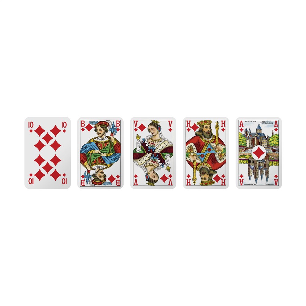 Speelkaarten van stevig 300 grams karton. Met Nederlandse afbeeldingen op de voorzijde (A/H/V/B) en hoektekens. De stok bestaat uit 52 speelkaarten en 2 jokers. Verpakt in een kartonnen doosje en cellofaan. Inclusief je eigen full colour ontwerp op de achterzijde van de kaarten en op het doosje. Zo creëer je een uniek, gepersonaliseerd kaartspel waarmee je gezien wordt tijdens elk potje kaarten.