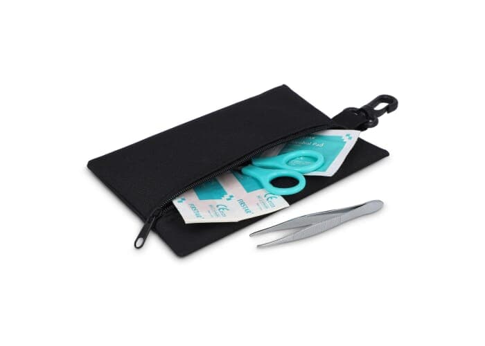 Deze EHBO set wordt geleverd in een handige 300D polyester etui met karabijnhaak en voldoet aan Europese normen. Ideaal voor reizen, outdoor-activiteiten of in de auto of rugzak voor kleine noodgevallen. Inhoud: 2 × non-adherente pads 5 × 7.5 cm, 1 × schaar, 1 × pack van 5 non-woven sponzen 2" × 2" 4-laags, 1 × medische tape 1.25 cm × 4.5 m, 2 × alcoholpads, 5 × pleisters 72 × 19 mm, 1 × elastisch crepeverband 5 × 450 cm, 1 × pincet.