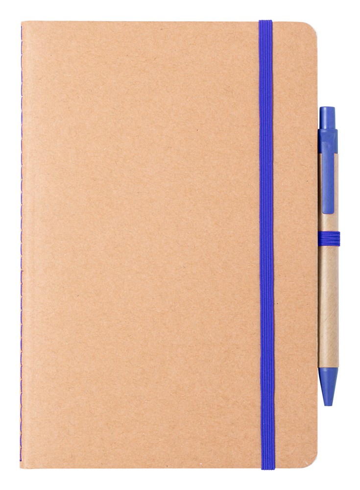 Notitieboek van gerecycled karton met 60 blanco vellen en gekleurde rubberen band, A5-formaat. Inclusief tarwestro plastic balpen. Blauw schrijvend.