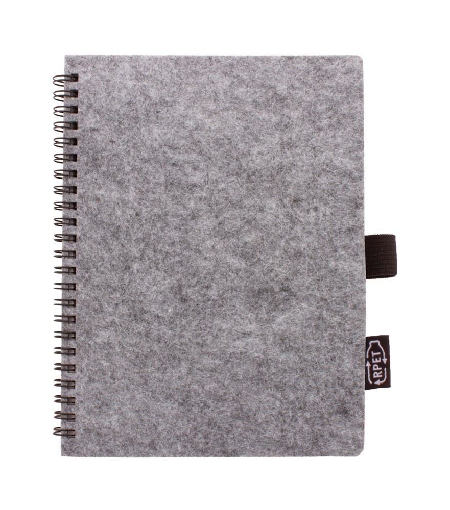RPET vilten spiraalnotitieboek met kenmerkend RPET-label en 80 gelinieerde vellen gerecycled papier. A6 formaat.