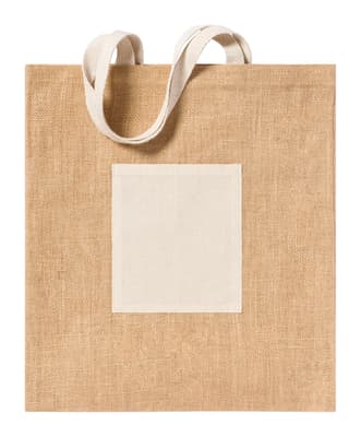 Jute boodschappentas met katoenen zak en lange hengsels.