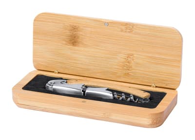 RVS kurkentrekker met flesopener en bamboe handvat, in bamboe kist. Laat je kurkentrekker bedrukken door De Pennenboer.