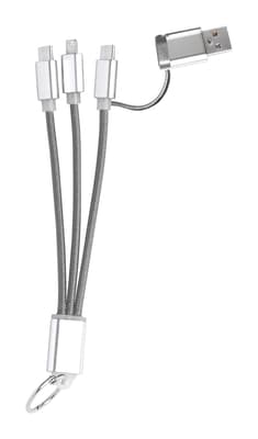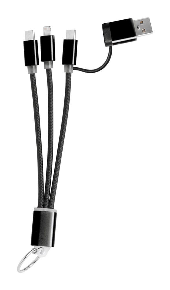 Aluminium USB-oplaadkabel met sleutelring. Met micro-USB-, USB-C- en Lightning-connectoren. Met USB- en USB-C-ingangen.