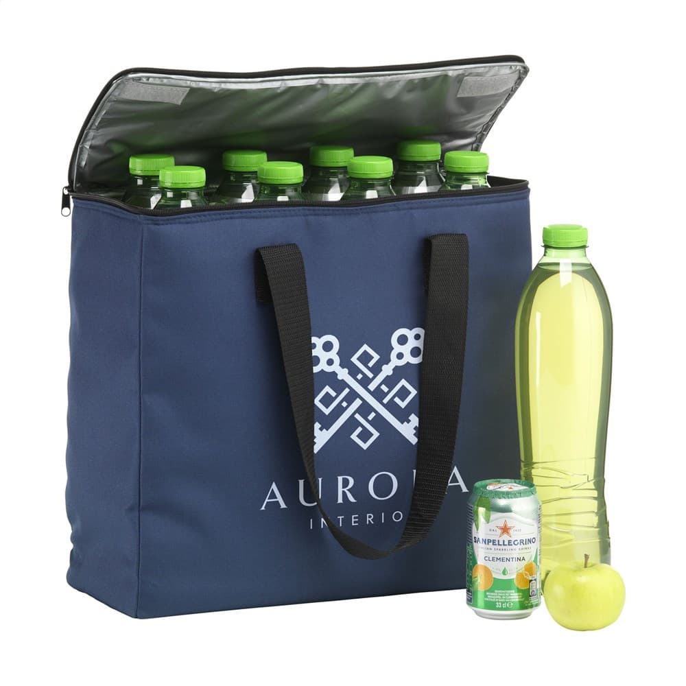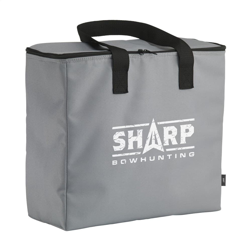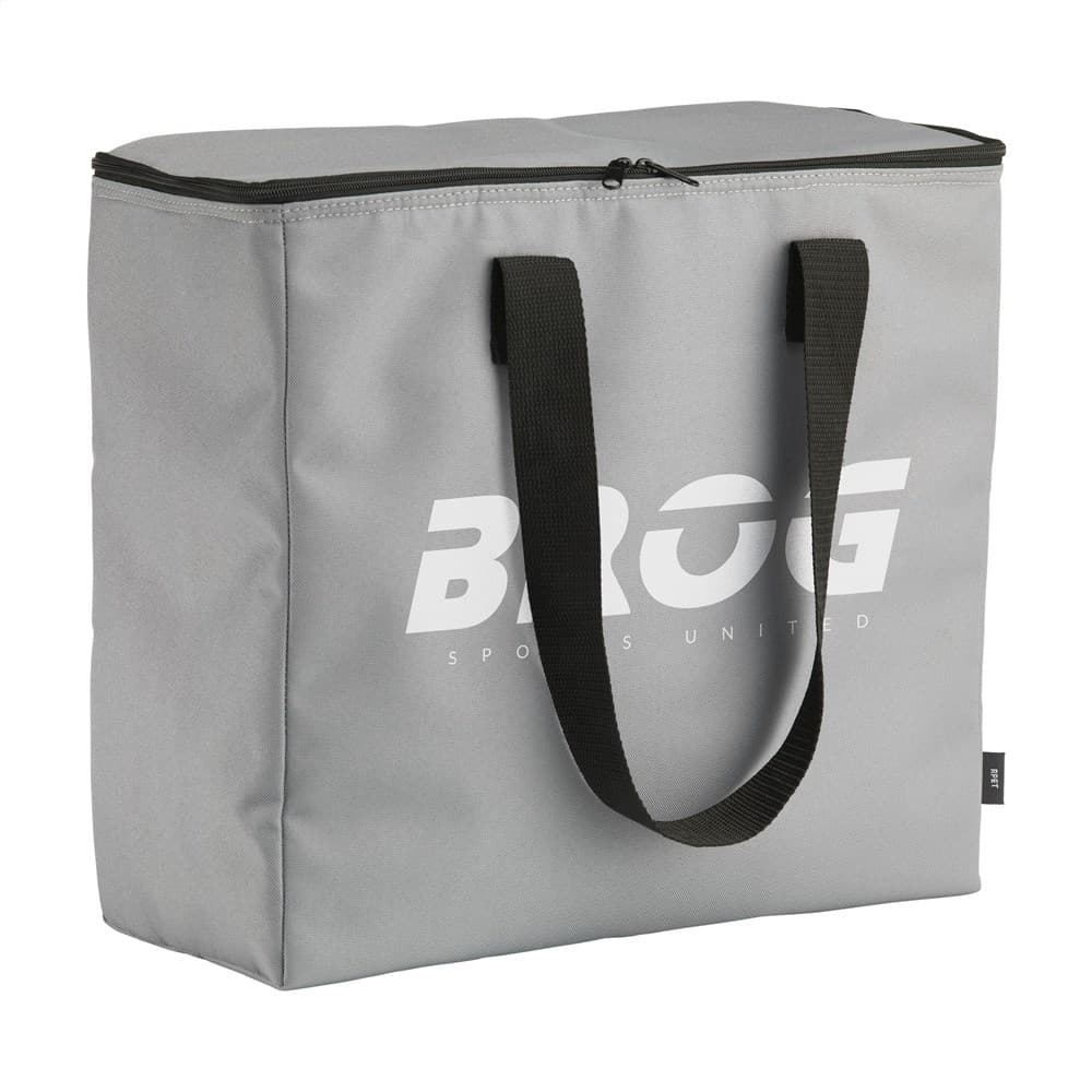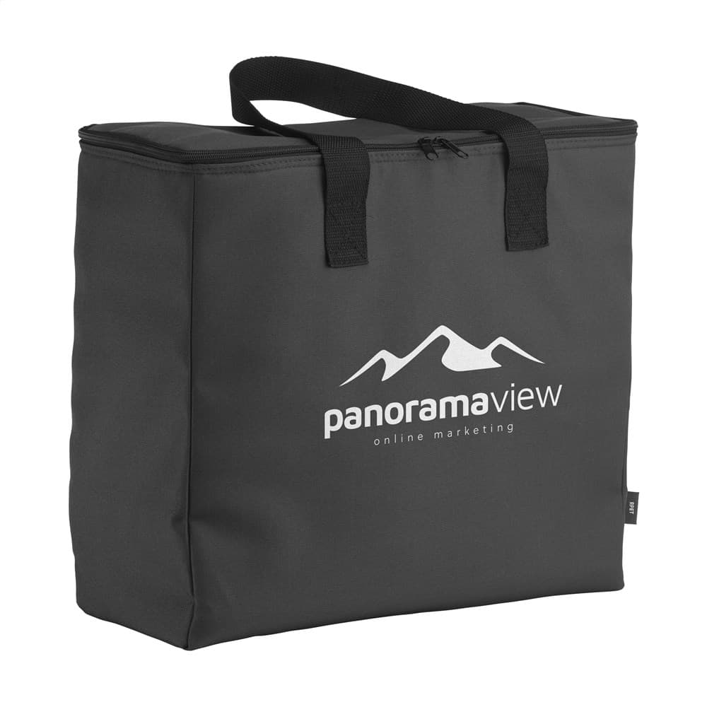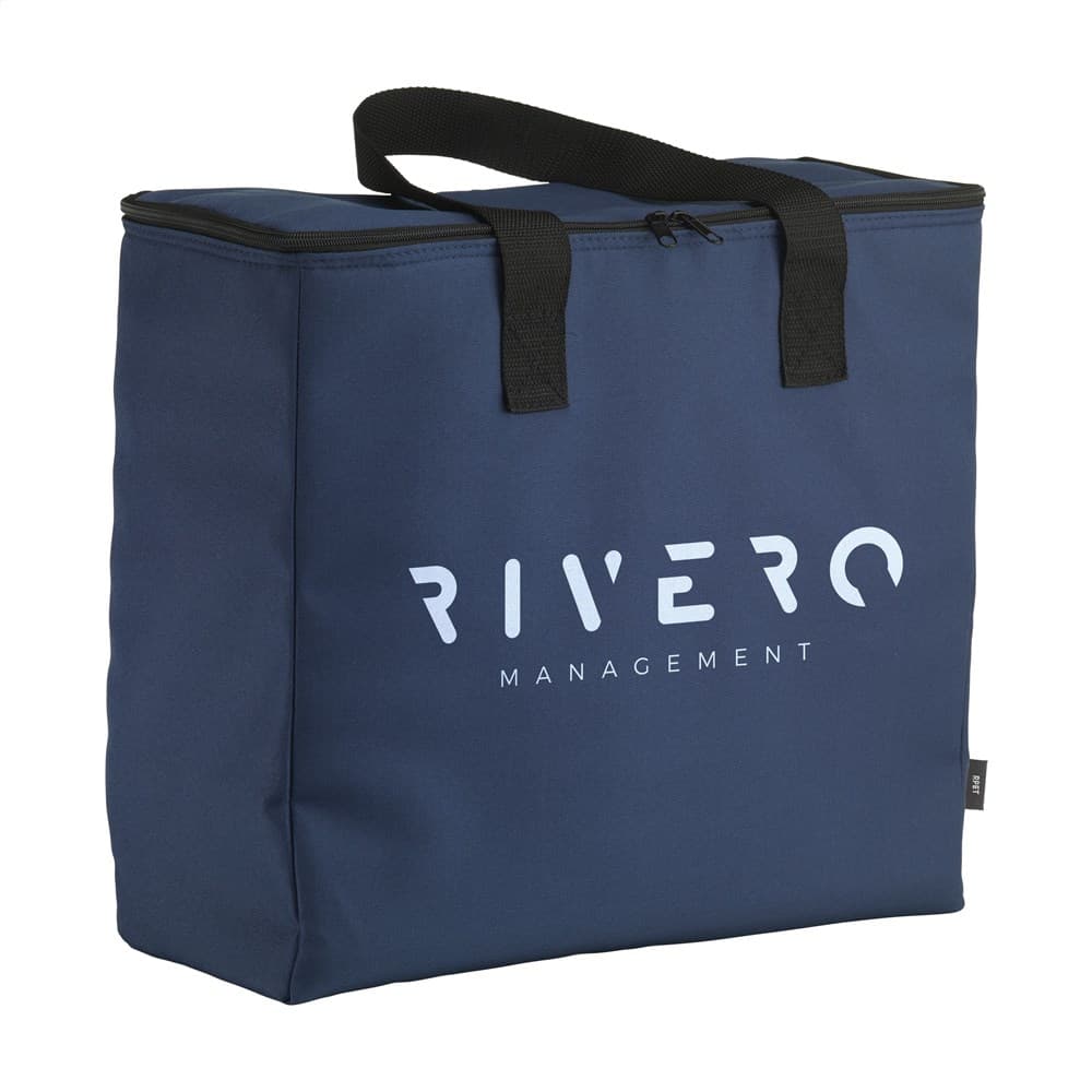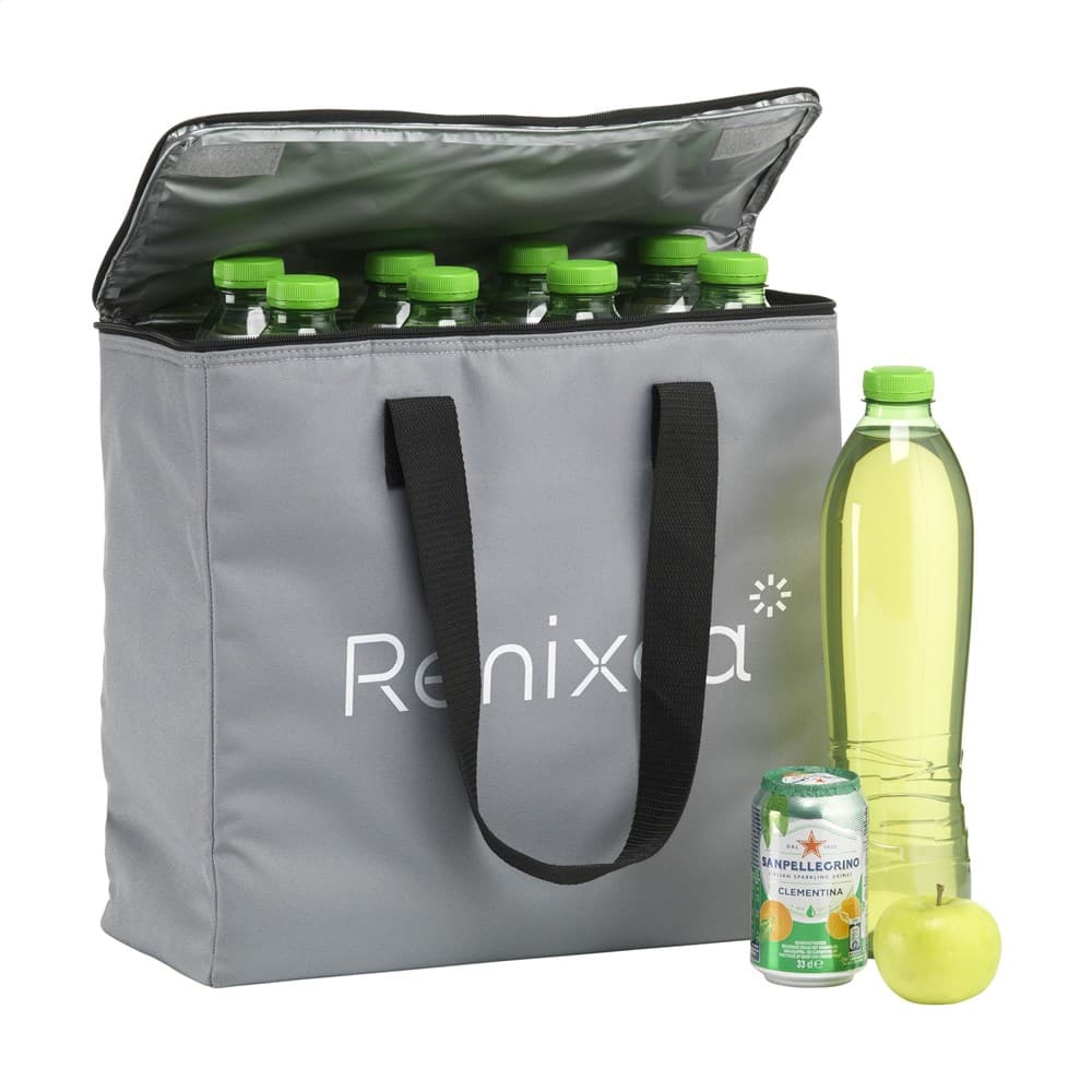WoW! Grote, stevige koeltas met ritssluiting en handgrepen. Gemaakt van 600D RPET polyester: gerecycled materiaal van PET-flessen en textielvezels. Met enorm veel opbergruimte. Er passen maar liefst 8 flessen van 1,5 liter in deze koeltas. Ook geschikt voor flessen tot 2 liter. Inhoud ca. 24 liter.