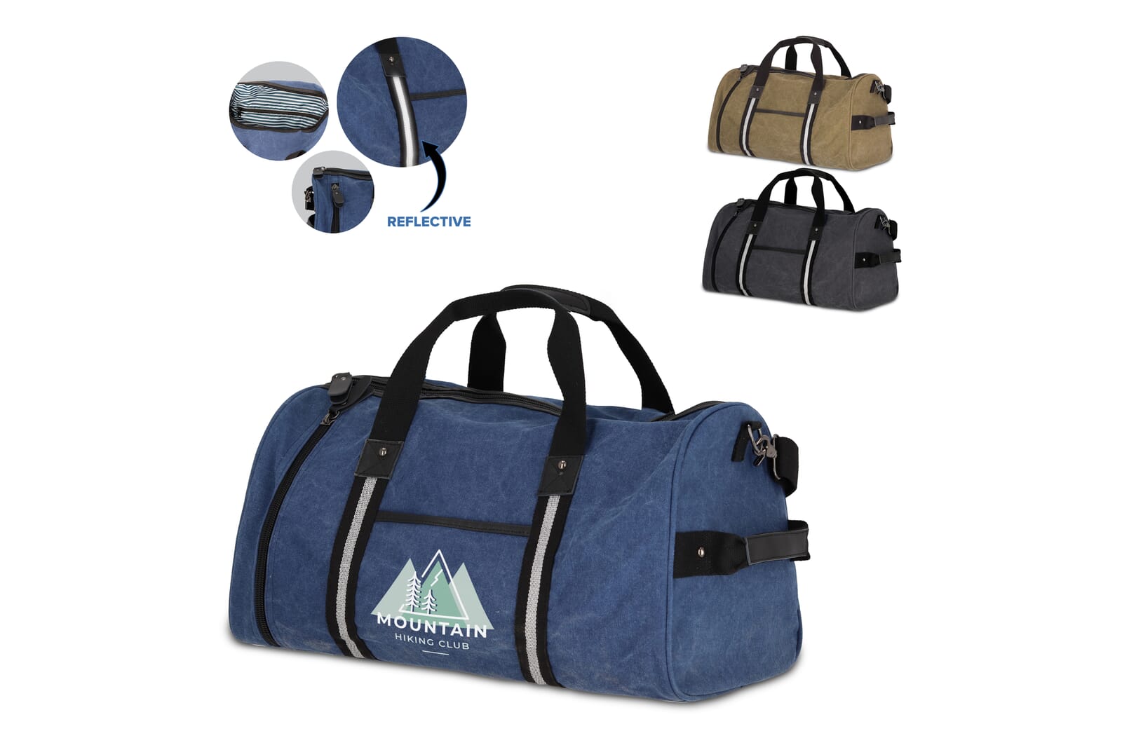 Stijlvolle plunjezak van gerecycled katoenen canvas. Met 100% gerecyclede reflecterende banden, luxe ritsen en trekkers en 100% gerecyclede polyester voering. Met handgreep aan de zijkant, verstelbare afneembare schouderriem, 1 zijvak, 2 voorvakken en 3 binnenvakken, waarvan één met ritssluiting.