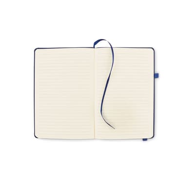 A5 notitieboek met 70% gerecycled leer en 30% PU latex omslag. Geval gebonden. 192 gelinieerde pagina's van gerecycled papier (96 vellen). Bijpassende elastische sluitband en penhouder.