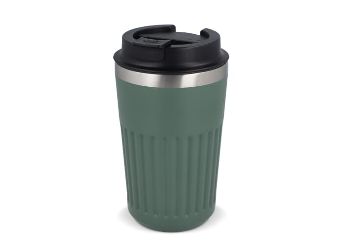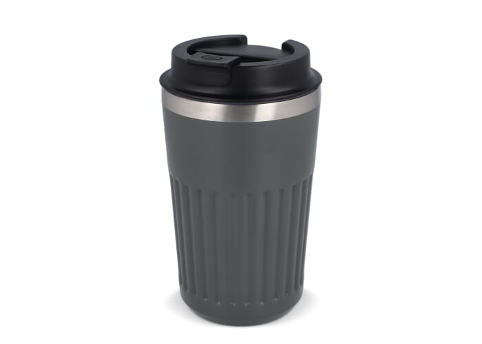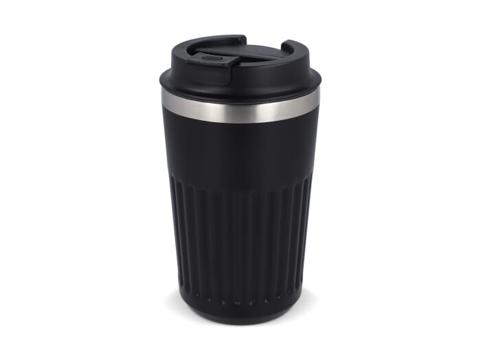 Gerecycled roestvrij stalen 400 ml koffie beker voor onderweg. De deksel is lekvrij. De beker heeft een modern strepenpatroon. Per stuk verpakt in een geschenkdoos.