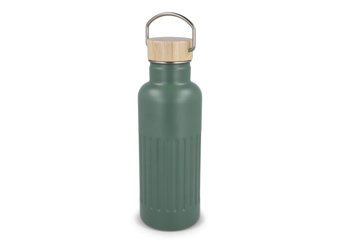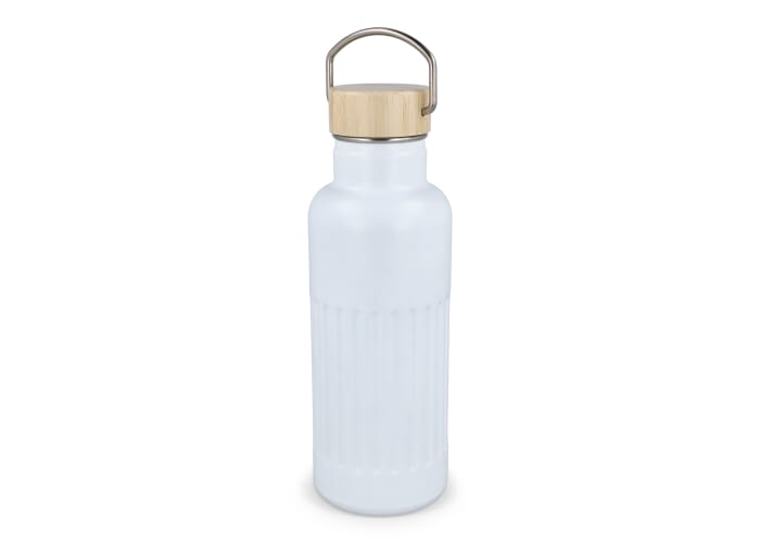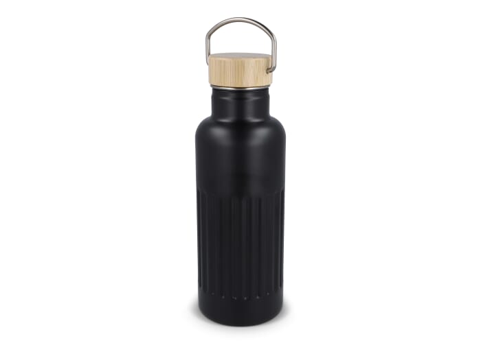 Thermo fles van gerecycled roestvrij staal (500 ml) met lekvrije bamboedop. De fles heeft een modern strepenpatroon. Per stuk verpakt in een geschenkdoos.