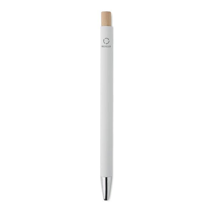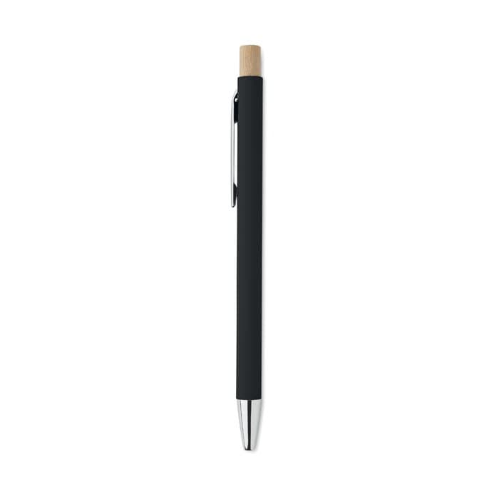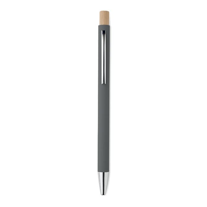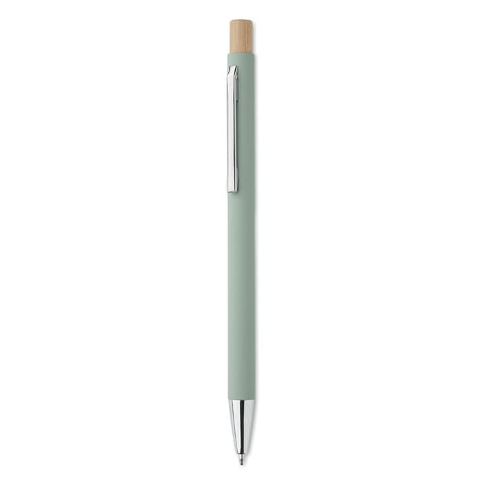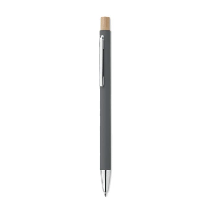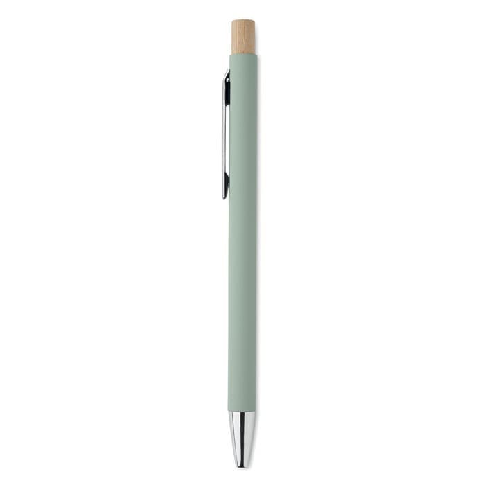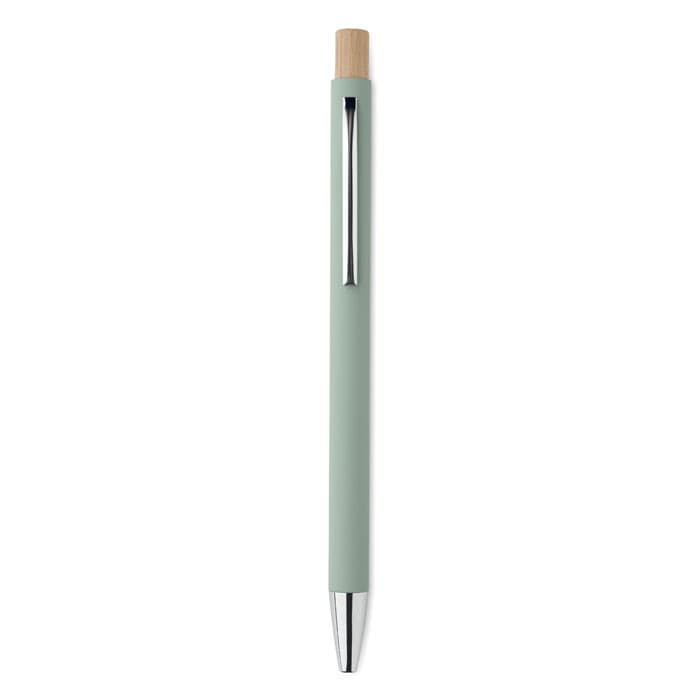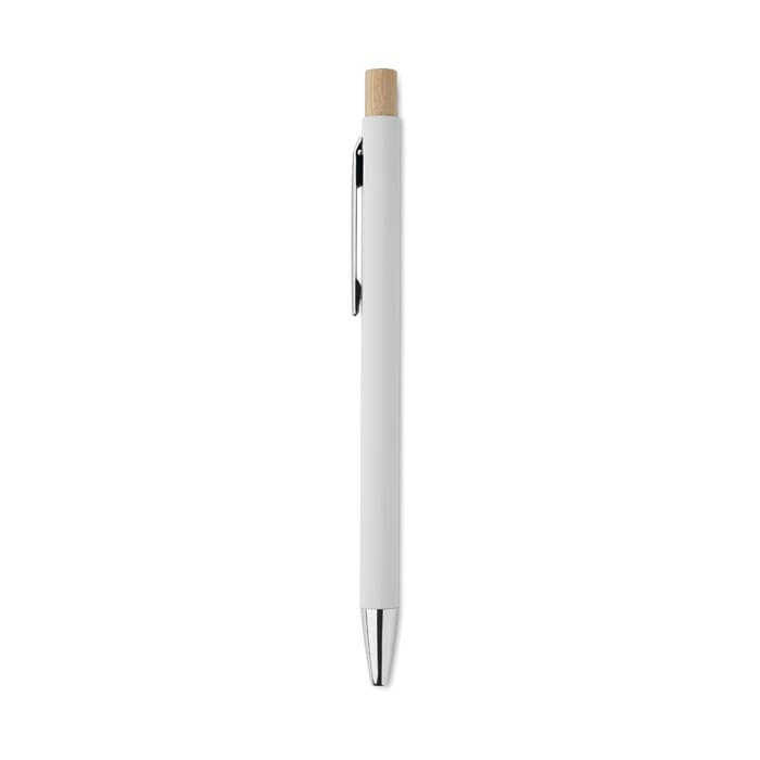 Gerecycled aluminium bal pen met bamboe drukknop. Zilveren punt en clip. Blauwe inkt.