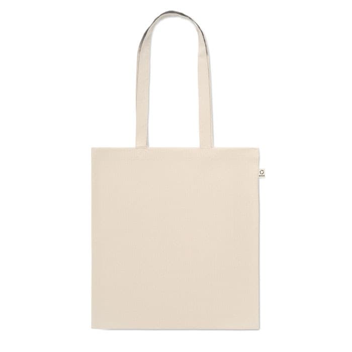 Gerecyclede pre-consumer katoenen boodschappentas (70% gerecycled katoen en 30% RPET) met lange hengsels. 140 gr/m².