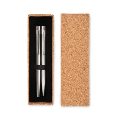 Gerecyclede roestvrijstalen pennenset met balpen en rollerbal. In bijpassende kurken doos. Respectievelijk blauwe en zwarte inkt. Kurk is een natuurlijk materiaal. Door de structurele aard en de porositeit van het materiaal kan het uiteindelijke drukresultaat per item afwijkingen vertonen.