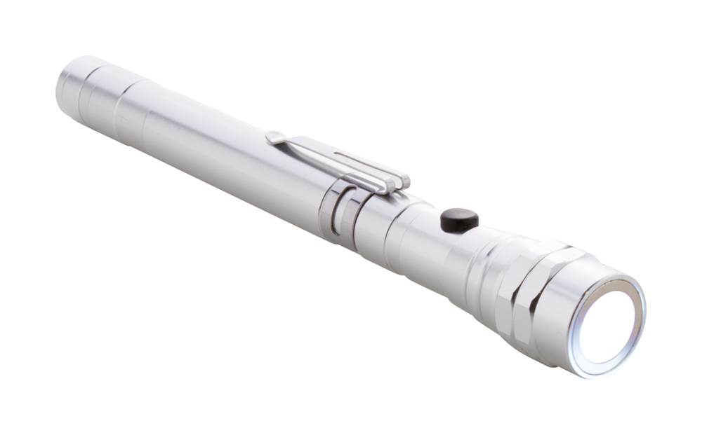 3 LED aluminium zaklamp met uitschuifbare en flexibele kop, magneet bovenop en metalen zijclip. Inclusief knoopcelbatterijen. Max. lengte: 57 cm.