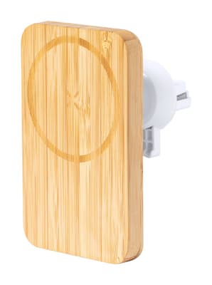 Magnetische auto mobiel houder in bamboe behuizing met ingebouwde draadloze snellader (15W) en verstelbare ventilator rooster montage. Inclusief zelfklevende metalen ring om de magnetische functie te gebruiken op elk draadloos oplaadbaar apparaat. Inclusief USB-oplaadkabel.