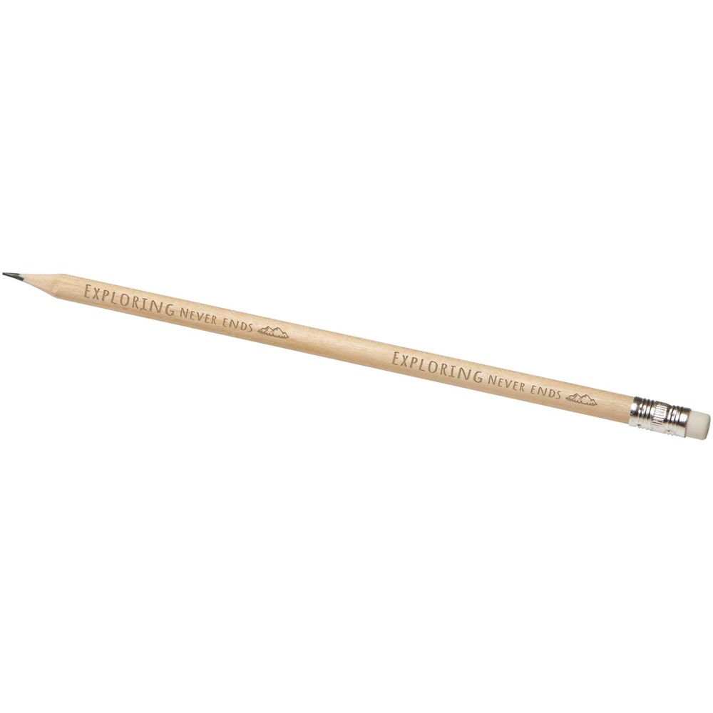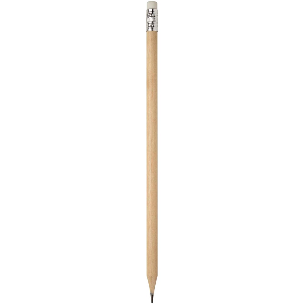 Potlood met gum. Het potlood is gemaakt van populierenhout, de gum is gemaakt van grafiet en de huls van aluminium.