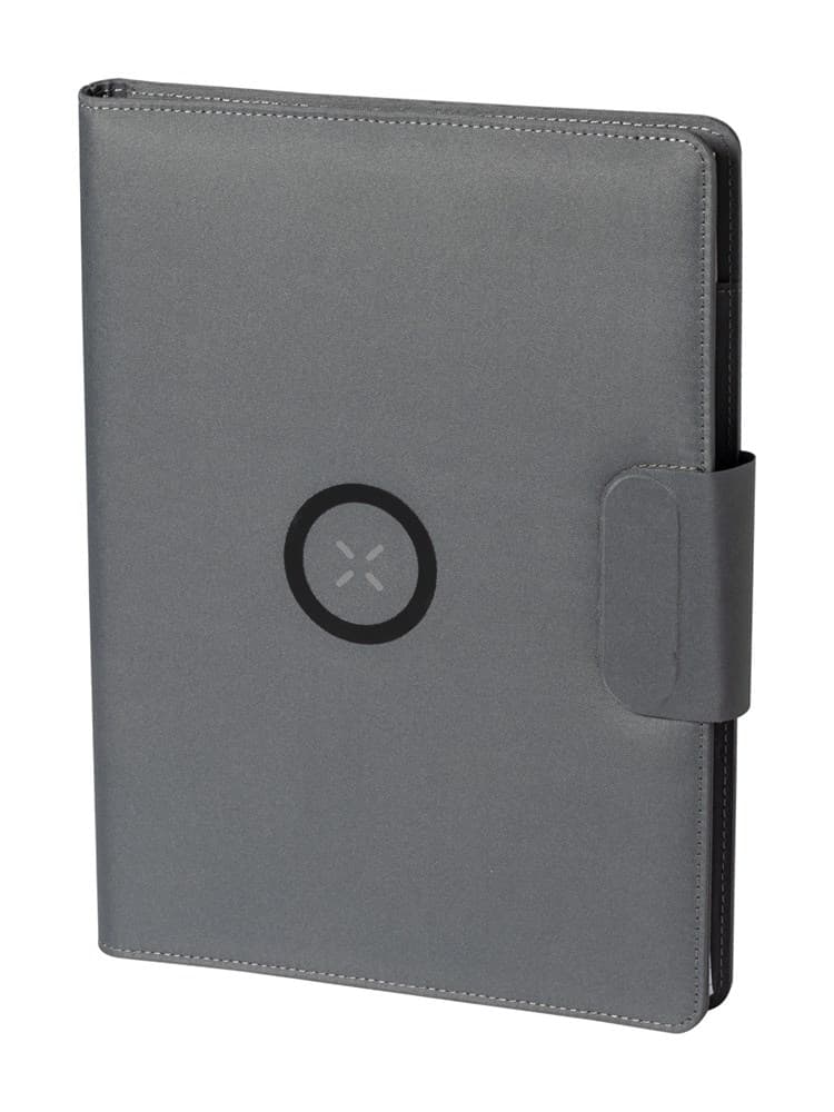 A4-formaat, 300D RPET polyester documentenmap met ingebouwde magnetische draadloze snellader (10W), 5000 mAh powerbank met USB-oplaadpoort, opvouwbare mobiele houder en notitieblok (20 gelinieerde vellen). Inclusief zelfklevende metalen ring om de magnetische functie te gebruiken op elk draadloos oplaadbaar apparaat. Inclusief USB-oplaadkabel.