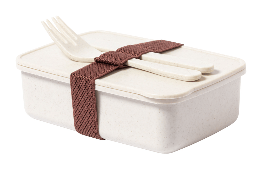 Lunchbox in PP kunststof met bestekset (mes en vork) en elastische band. 700 ml.