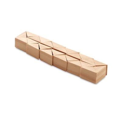 Dennenhouten 24-delige twistpuzzel en hersenkraker. Gepresenteerd in een katoenen zakje.