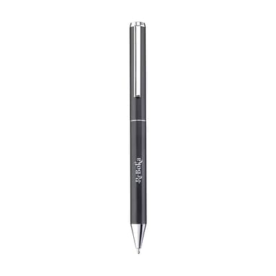 WoW! Blauwschrijvende balpen gemaakt van gerecycled aluminium. Met verchroomde clip en accenten. De pen heeft een draaikliksysteem. Een slank model met een chique uitstraling. Per stuk in een giftbox van zwart kraft karton. Door het gebruik van gerecycled aluminium worden minder nieuwe grondstoffen gebruikt. Dit betekent minder energieverbruik, minder gebruik van water en reductie van de CO2 uitstoot. Een verantwoorde keuze.