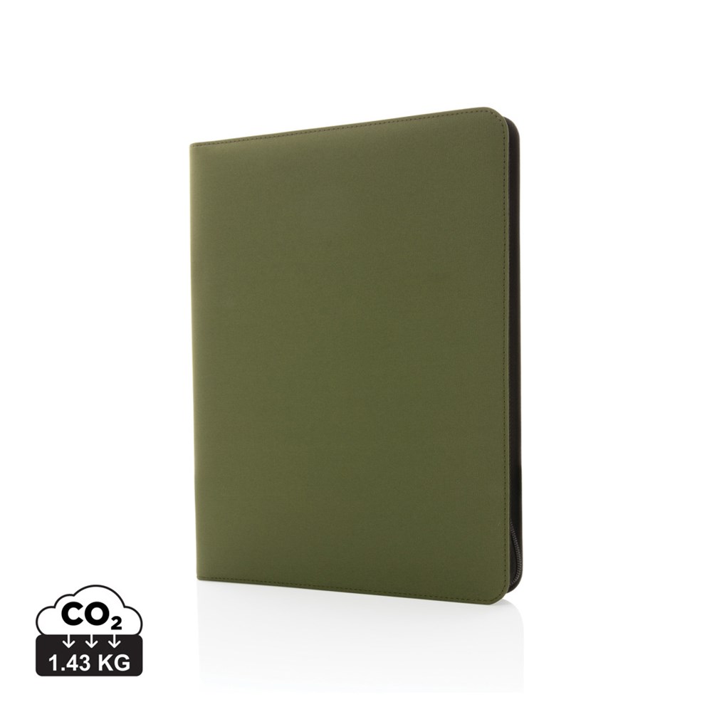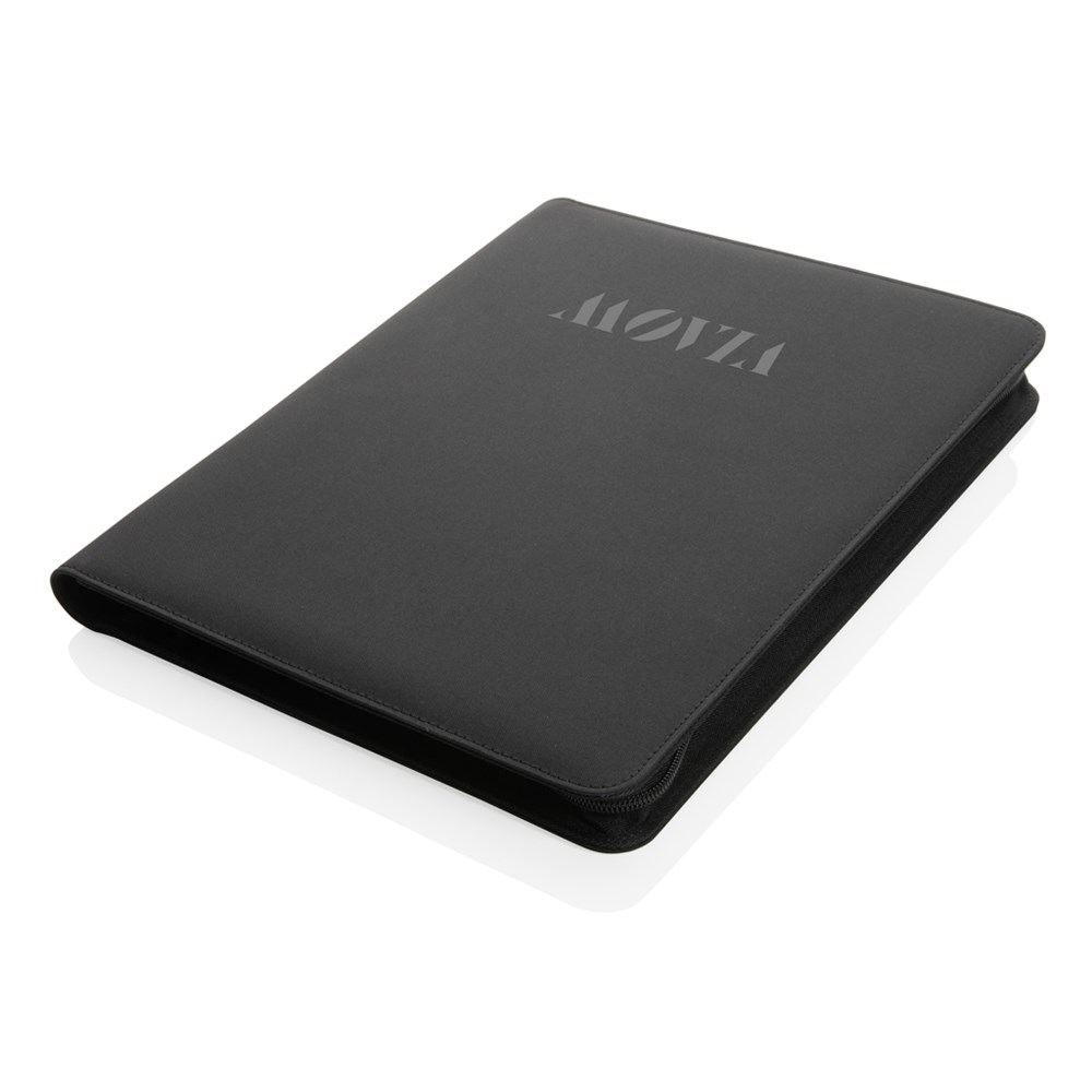 Deze A4 Impact AWARE™ deluxe 300D tech portfolio met ritssluiting voegt een beetje extra verfijning toe aan je werk. Bewaar uw belangrijke documenten, kaarten en notities bij elkaar. In het A4-portfolio vindt u een gelinieerd schrijfblok van 64 g/2 gerecycled papier met 20 pagina's. Binnenin is er 1 telefoonvak, een telefoonhouder, pennenlus en 2 sleuven voor visitekaartjes. Met AWARE™ tracer die het echte gebruik van gerecyclede materialen valideert. Elke portfolio bespaart 4,8 liter water en heeft 8 0,5L PET-flessen hergebruikt. 2% van de opbrengst van elk verkocht Impact-product wordt gedoneerd aan Water.org. PVC-vrij.