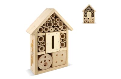 FSC-houten insectenhotel dat onderdak biedt aan lieveheersbeestjes, gaasvliegen en solitaire bijen. Ondersteunt de biodiversiteit door bestuiving en natuurlijke ongediertebestrijding. Ideaal voor tuinen en balkons, duurzaam en leerzaam, waardoor het een doordacht relatiegeschenk is.