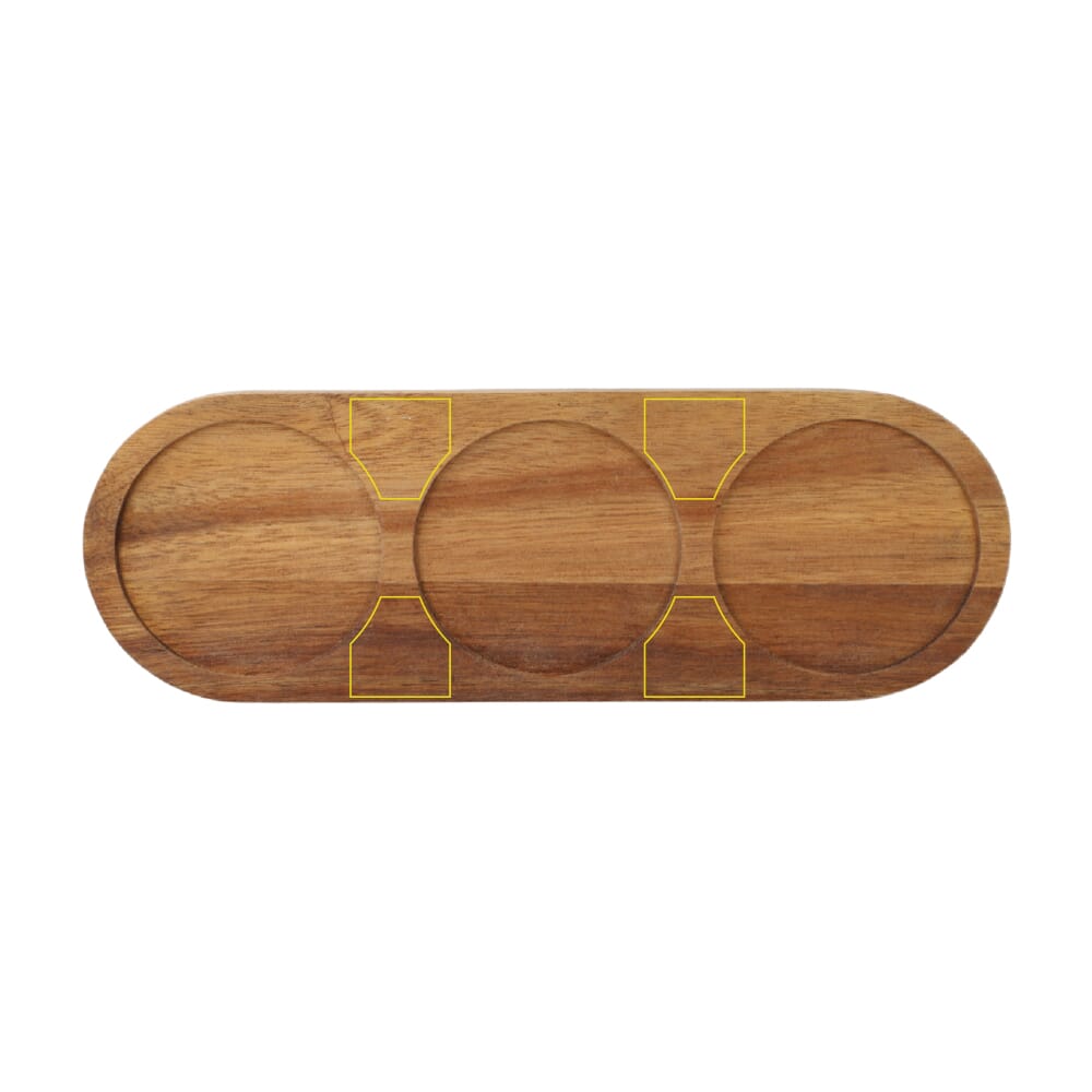 Breng verfijning naar je borreltafel, diner of ontbijt met deze elegante houten standaard gemaakt van acaciahout, compleet met drie ronde keramieken kommetjes. Elk kommetje heeft een uniek karakter dankzij het speciale glazuurproces, wat zorgt voor een mooie glans en een authentieke uitstraling, wat je presentatie extra bijzonder maakt.