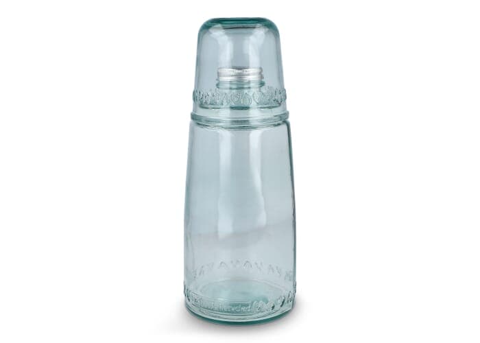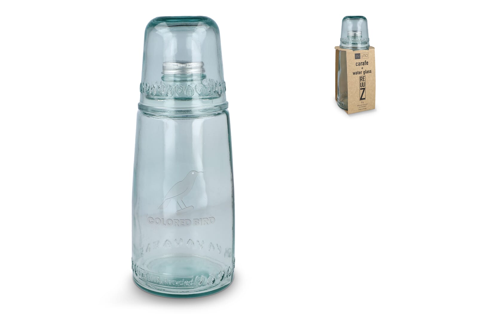 Ontdek de InSideOut ReuuZ karaf van 1 liter met metalen dop en bijpassend waterglas dat erop past. Gemaakt in Europa van 100% post-consumer gerecycled glas, met een duidelijke gerecyclede look. Het resultaat is een verantwoord product met een basic, natuurlijke uitstraling. Ideale hulp om je hydratatie op peil te houden, thuis of op je werk.