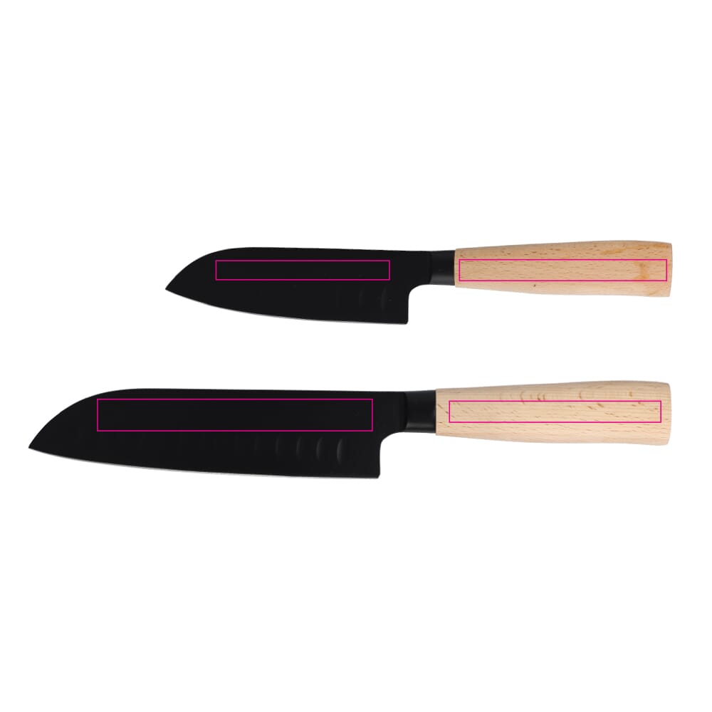 Wat deze set onderscheidt, zijn de opvallende zwarte lemmeten in combinatie met de strakke FSC-gecertificeerde beech houten handgrepen, wat een moderne, verfijnde look creëert. De set bestaat uit twee messen één van 30cm en één van 24cm, elegant verpakt in een luxe geschenkdoos - perfect om cadeau te doen of voor persoonlijk gebruik. Gebruik in de vaatwasser wordt afgeraden. Gebruik in de vaatwasser wordt afgeraden.