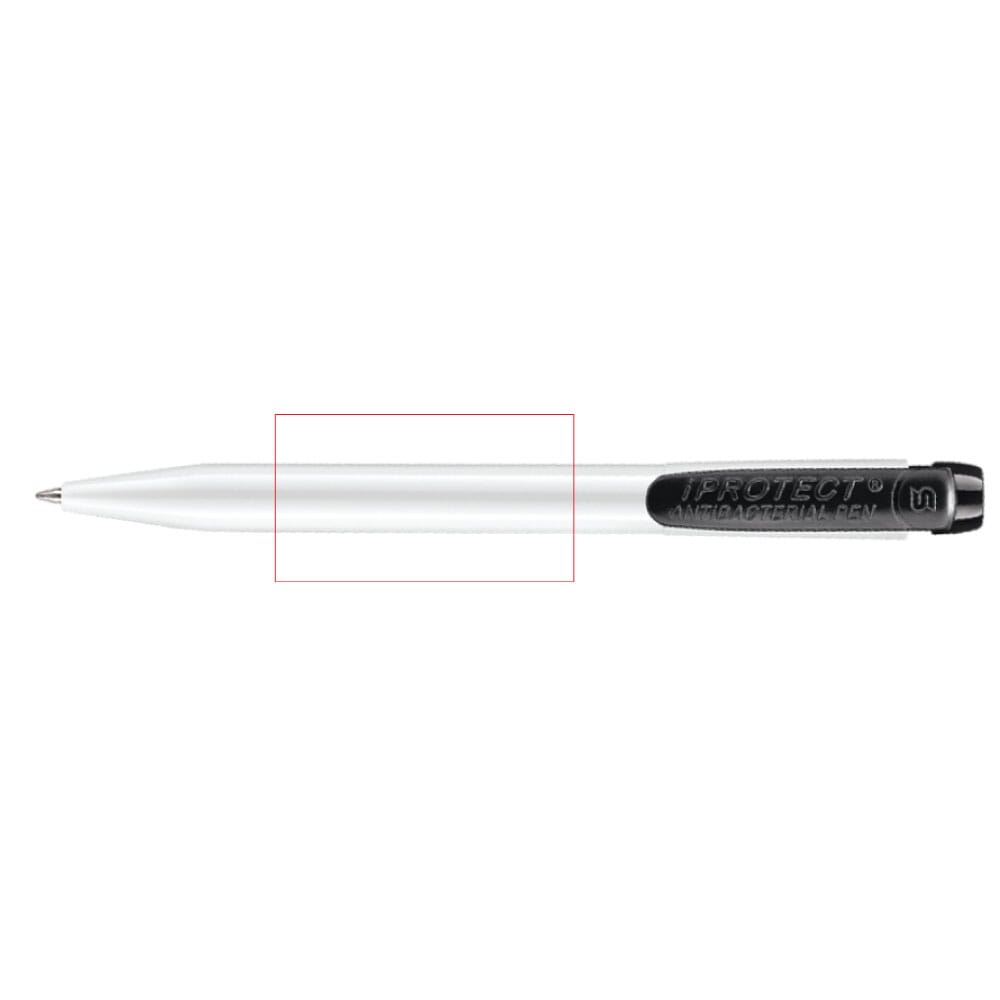Pennen kunnen grote boosdoeners zijn in het verspreiden van bacteriën. Deze pen is gecertificeerd volgens de ISO 22196 normering. Het is de promotionele pen voor bedrijven in de medische wereld en ook zeer geschikt voor bijvoorbeeld scholen, horeca en publieke instellingen. Deze IProtect pen komt met een witte barrel en een gekleurde clip. Bevat een X20 vulling met blauw schrijvende inkt. De pen heeft een drukmechaniek en is gemaakt van ABS kunststof met zink-ionen. Geproduceerd in Europa.