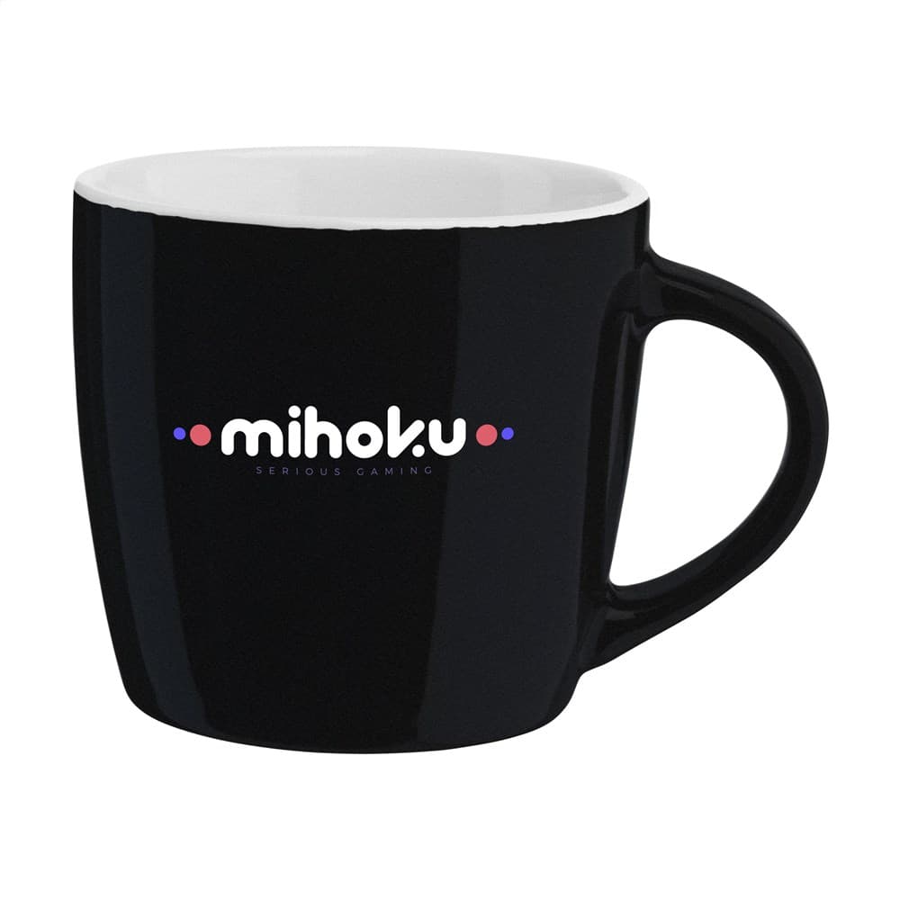 Keramische kwaliteitsmok met royaal oor. In geheel wit óf met gekleurde buitenzijde. Inhoud 340 ml. Vaatwasserbestendig. De opdruk is vaatwasmachine getest en gecertificeerd: EN 12875-2.