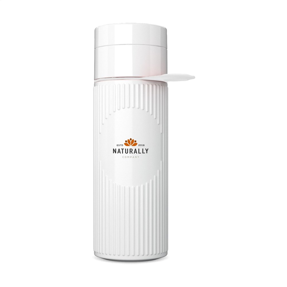 Herbruikbare waterfles van het merk Join The Pipe. Deze duurzame fles is gemaakt van BIO HDPE. Deze kunststof wordt gemaakt van het afval van de suikerrietplant. Het fraaie 3D ribbelpatroon geeft de fles een opvallend fraaie uitstraling. De fles heeft 2 openingen met schroefdop: een drinkopening en een royale opening voor het gemakkelijk schoonmaken van de fles of het toevoegen van ijsblokjes. Met handige, rubberen draaglus. Lekvrij en BPA-vrij. Vaatwasserbestendig tot 65°C. Voor behoud van de opdruk wordt met de hand afwassen aanbevolen. Inhoud 500 ml. Made in Holland.
