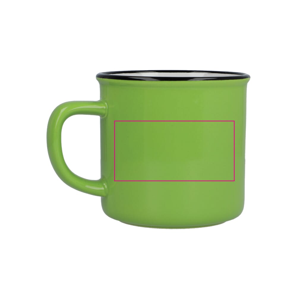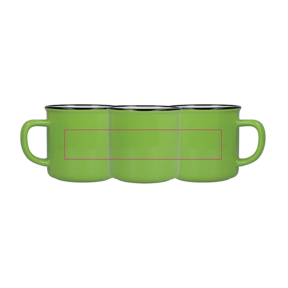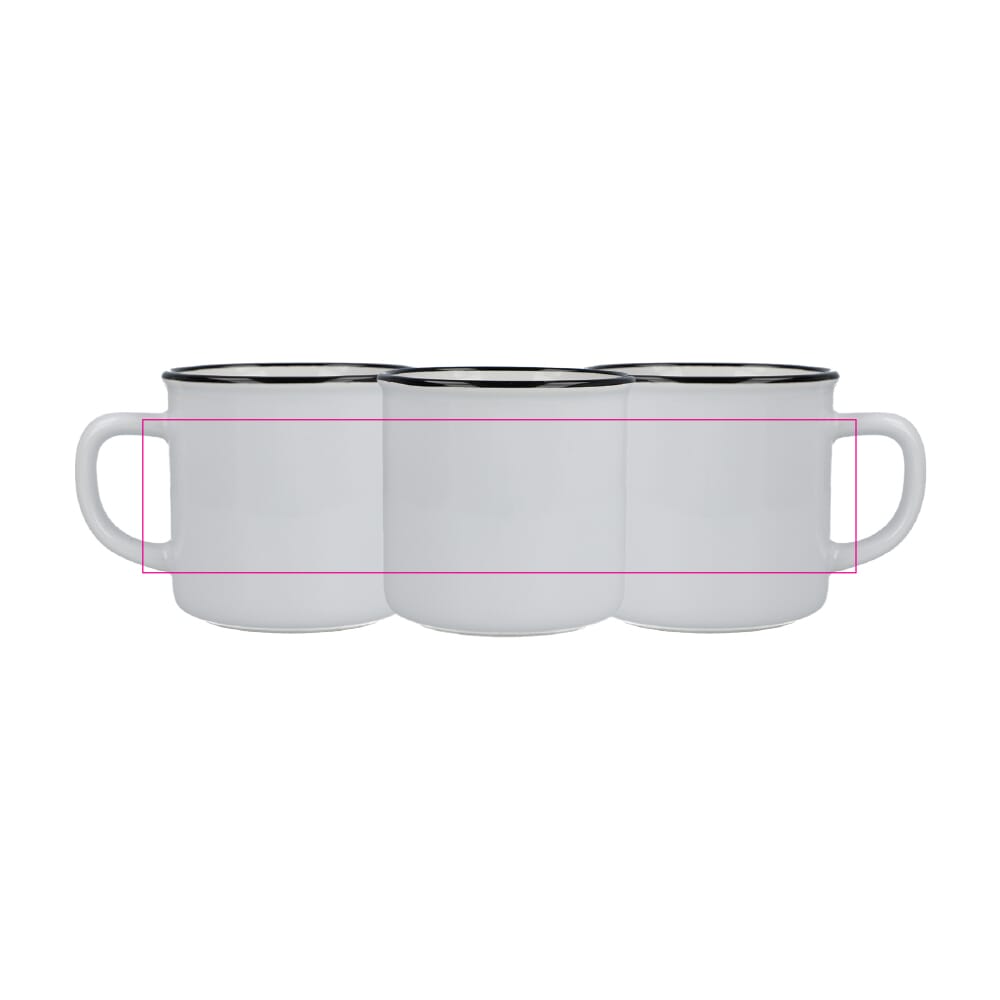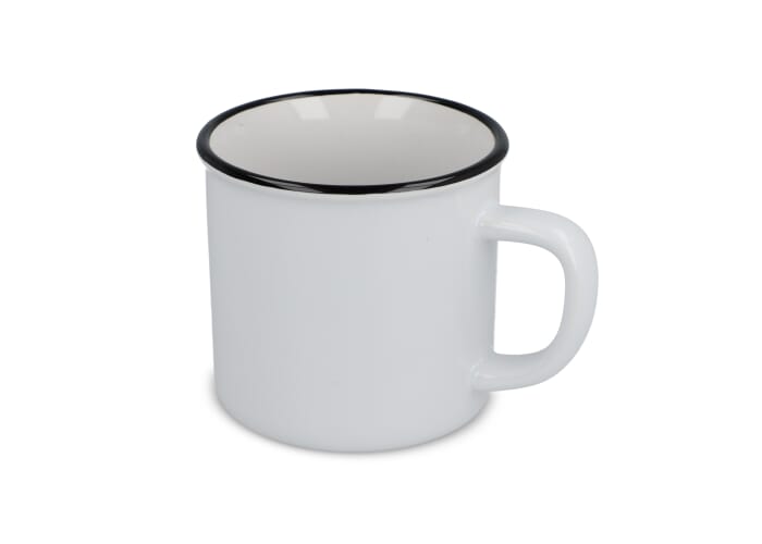 Deze keramische mok in emaille-stijl combineert vintage charme met levendige kleuren. Perfect voor koffie, thee of elk warm drankje, het heeft een klassiek ontwerp met een glanzende afwerking en een zwarte rand, die de essentie van traditionele emaille mokken uitstraalt. Ideaal voor thuis of op kantoor, het voegt een tijdloze uitstraling toe aan elke mokkencollectie.
