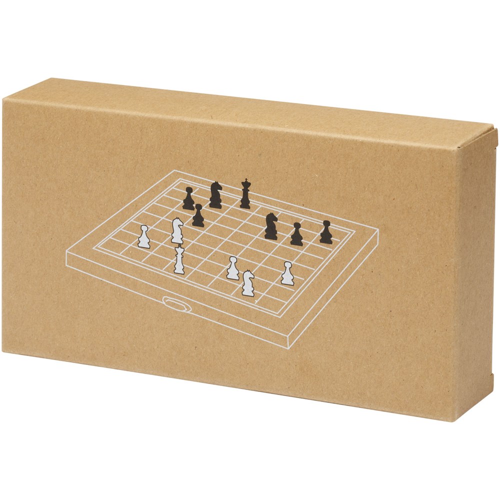 Geniet van de intellectuele stimulatie van schaken waar je ook gaat met het King schaakspel. Deze set biedt een perfecte combinatie van draagbaarheid en elegantie en bestaat uit 32 schaakstukken in bruine en ivoren kleuren die prachtig zijn gemaakt van verantwoord geproduceerd dennenhout. De opvouwbare houten kist zorgt voor handige opslag en transport. De stevige metalen scharnieren en vergrendeling zorgen ervoor dat het schaakspel altijd veilig en beschermd blijft. Geleverd met een geschenkverpakking van kraftpapier en handleiding. Waarschuwing! Niet geschikt voor kinderen jonger dan drie jaar. Kleine onderdelen. Gevaar voor verstikking.